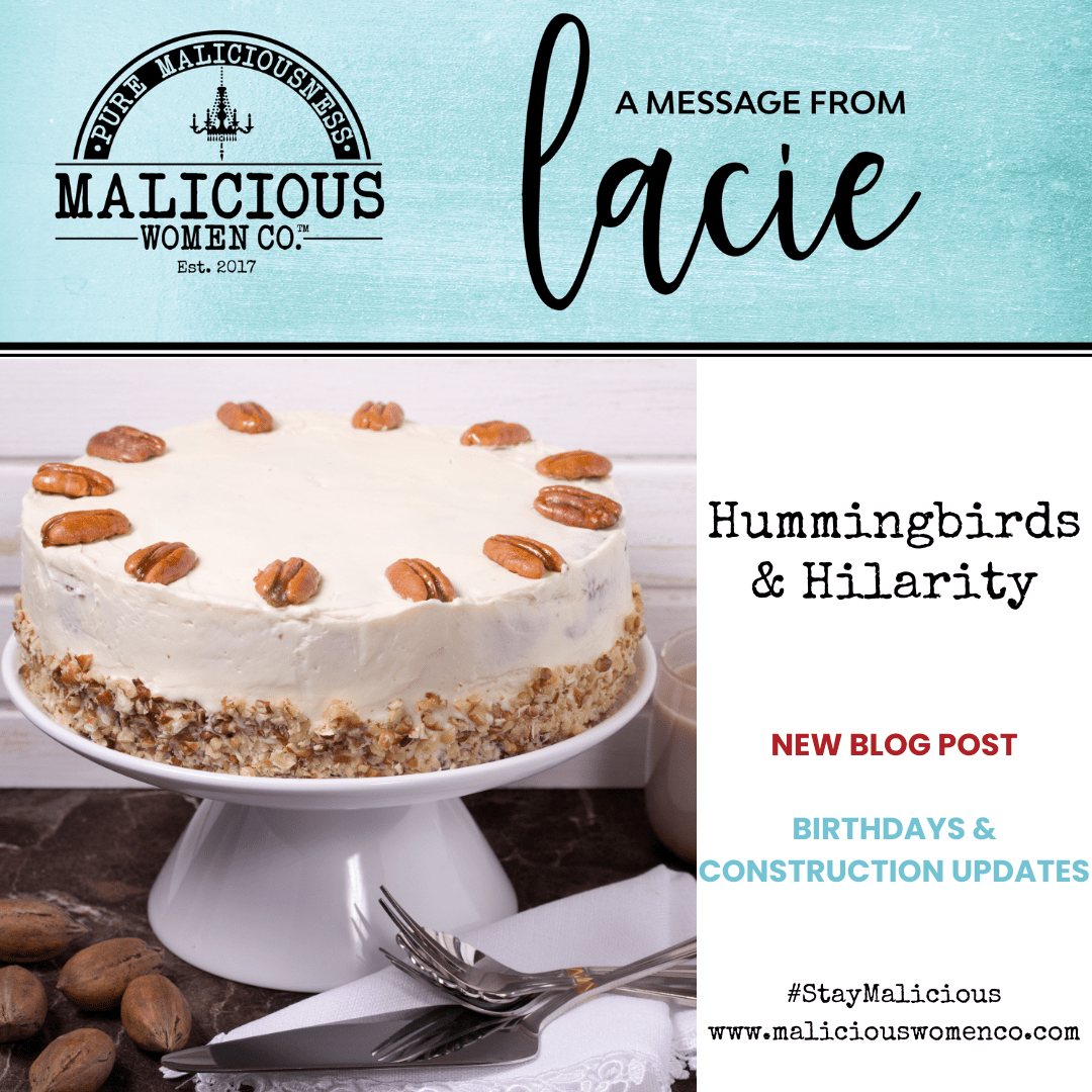 The other thing that is occupying my week is the continued construction on the candle pouring studio. I officially chose the name Malicious Intent. I have over 70 scents to mix and blend and 20 different vessels to choose from. The classes will range from $40 to $60 depending on the vessel chosen. It looks soooo good! I found out it is going to take about 3 months to get my wine permit, but I will not be checking anyone’s Stanley cups. 😉